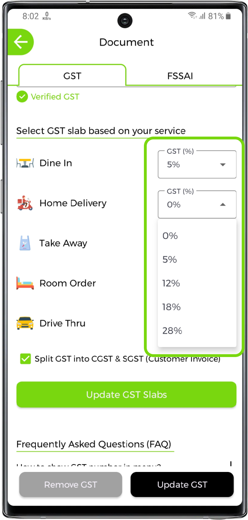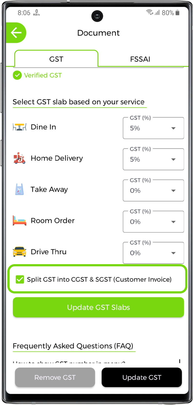 GST slabs are used to add different gst in different services. Let's say you want 5% Gst on dinein orders and 18% Gst on room orders then you can set according to that. When customer will order food, gst will be added according to the slabs you have selected here.