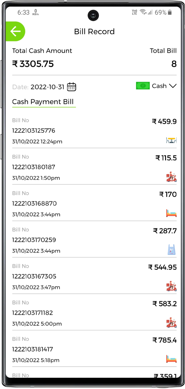 List of cash payment orders of the selected date will be listed. Also total cash amount will be shown