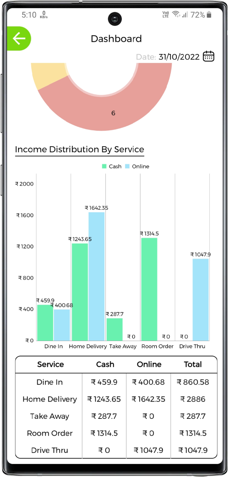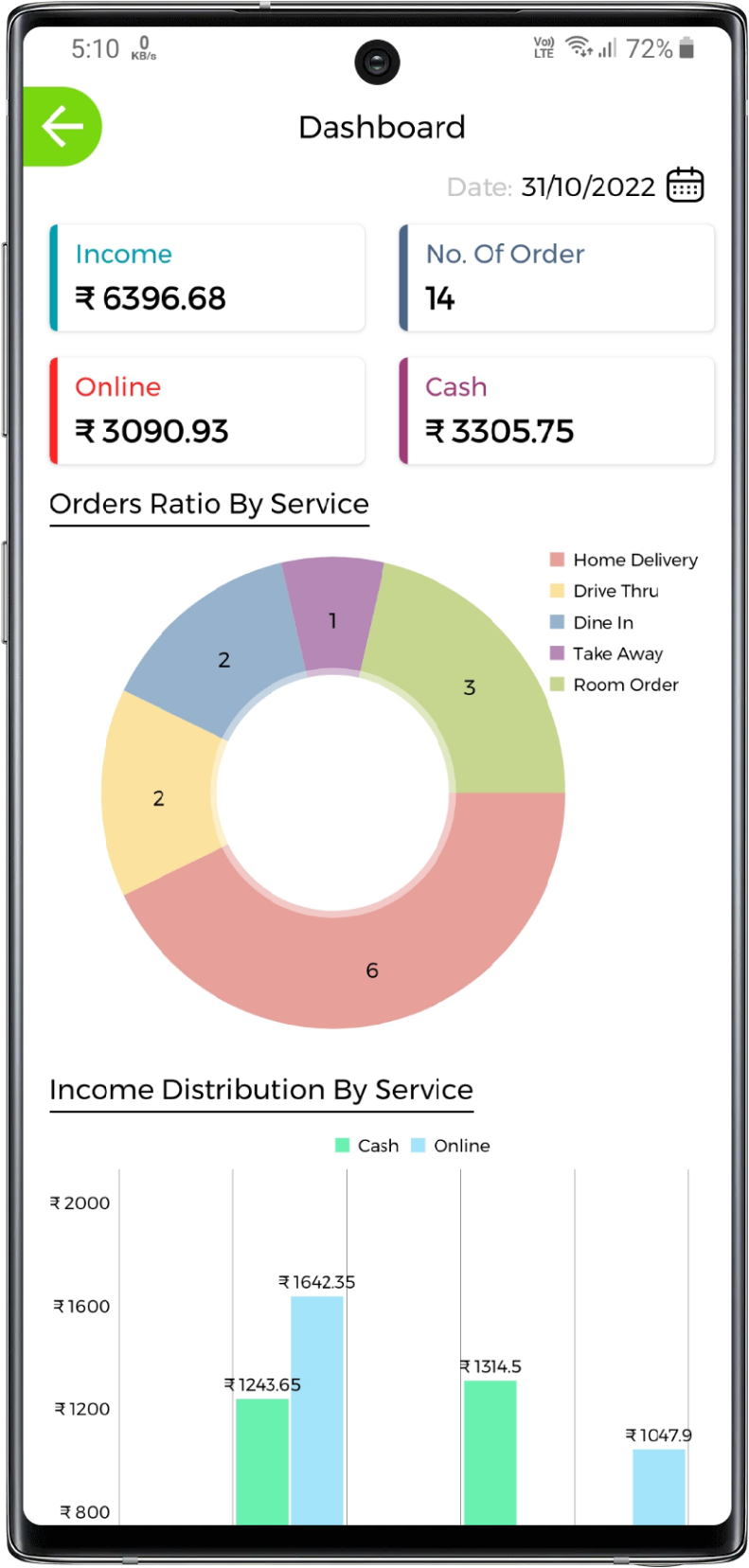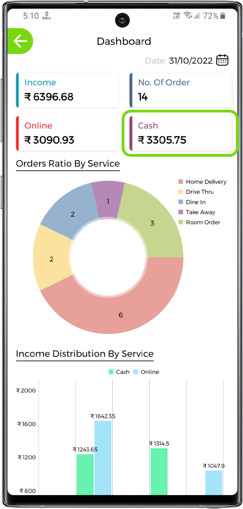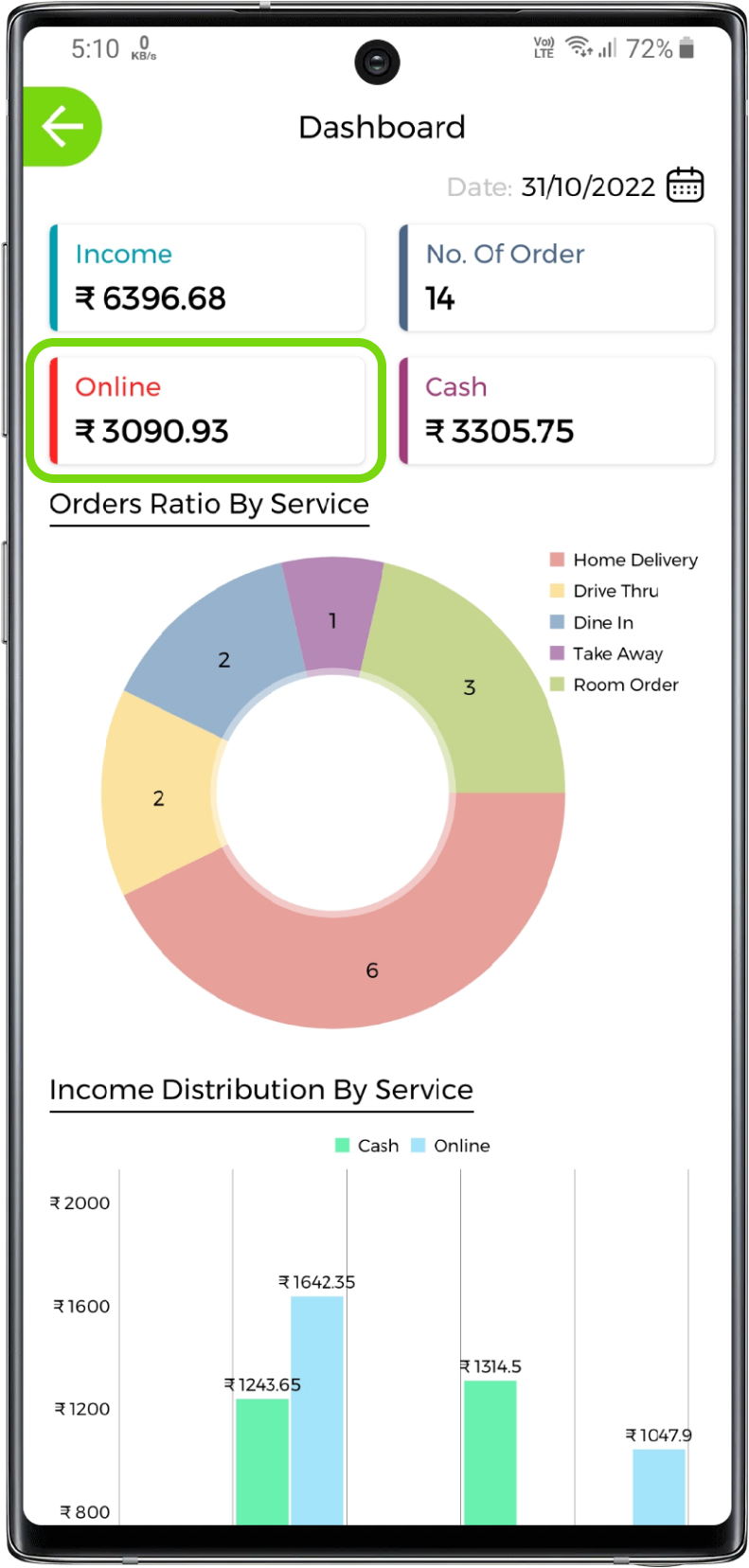 Dashboard shows you the total income, total no. of orders, total online payment, total cash payment of the selected date