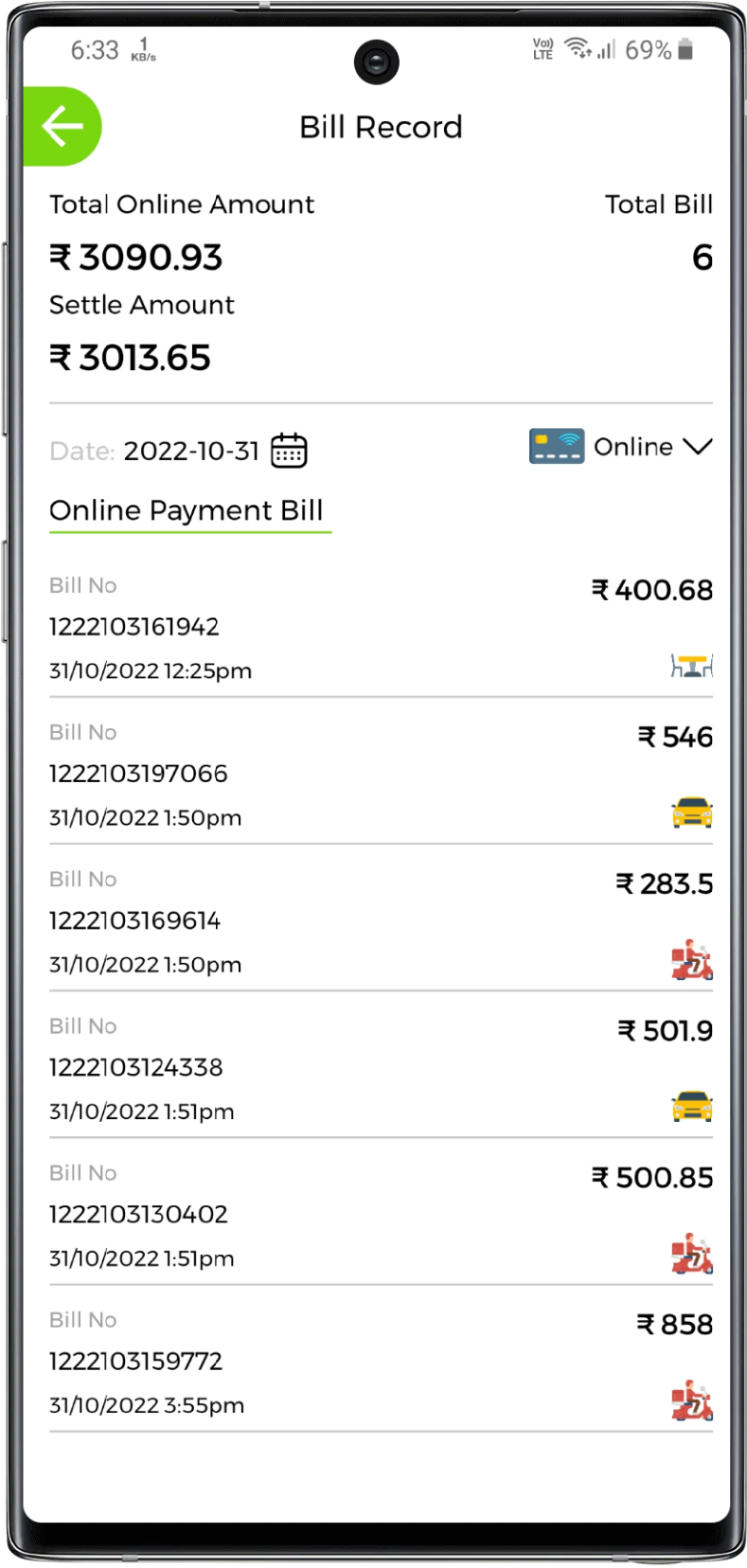 List of online payment orders of the selected date will be listed. Also total online amount and settle amount will be shown