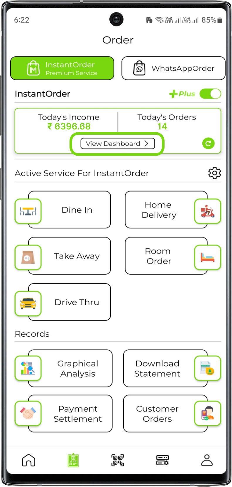 Dashboard gives you the brief overview of your daily orders. You will get a nice briefing of your day to day record like your outlet's total income, total orders, total amount received in cash, total amount received in online, orders ratio by service, income distribution by service, and many other things. You can even get the record of any day by customizing the date