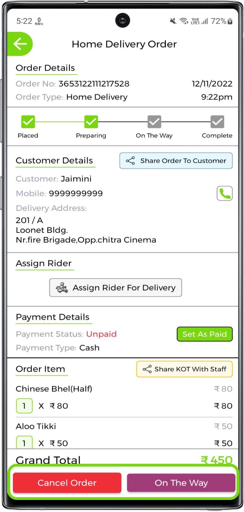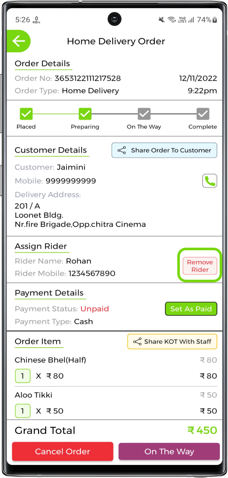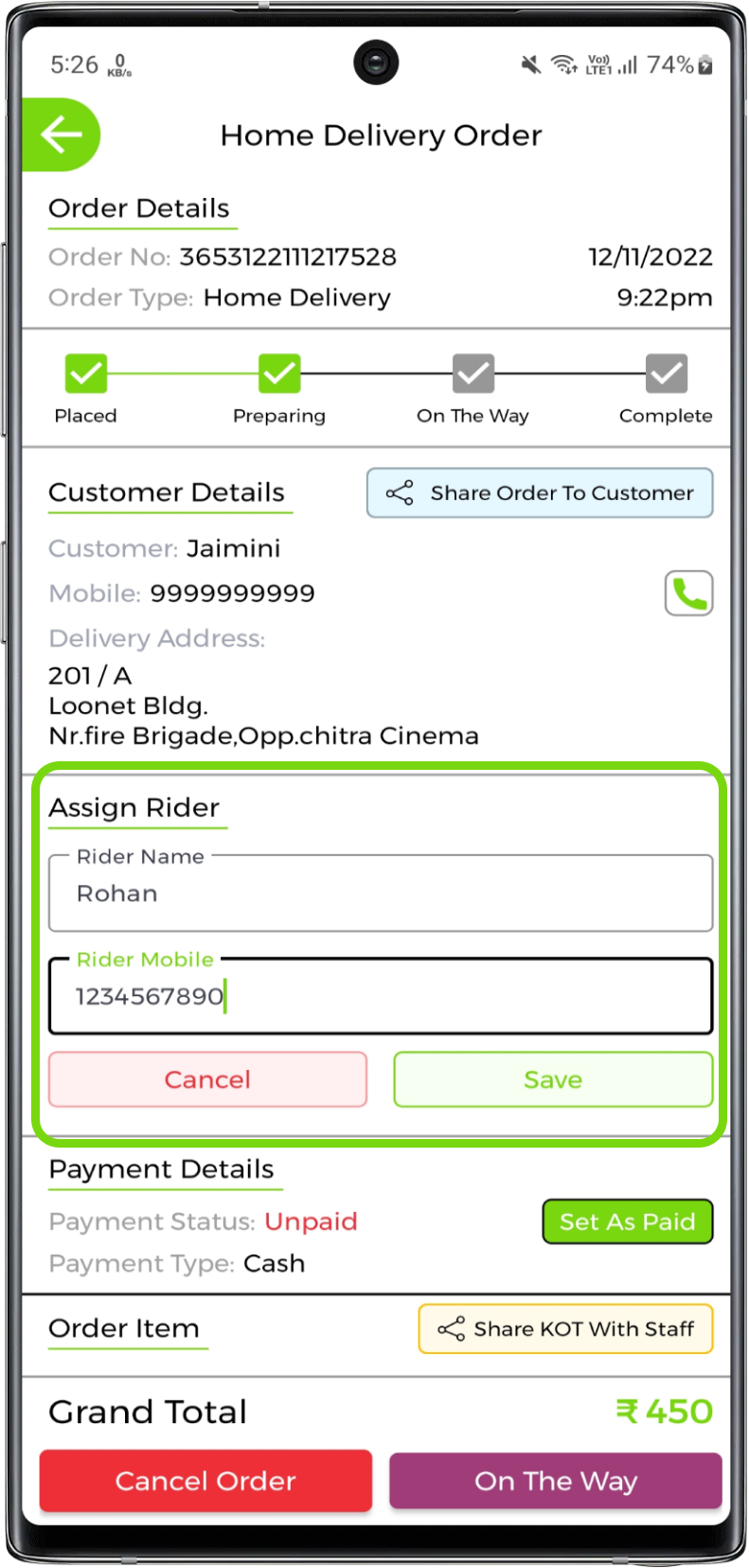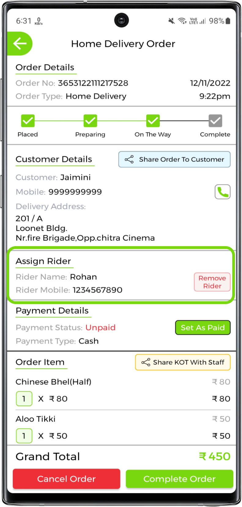In this preparing stage you can add/update rider details like rider name and rider contact no who will deliver this order. This details will be viewed to customer to know who is going to deliver his food and he can even contact the rider
