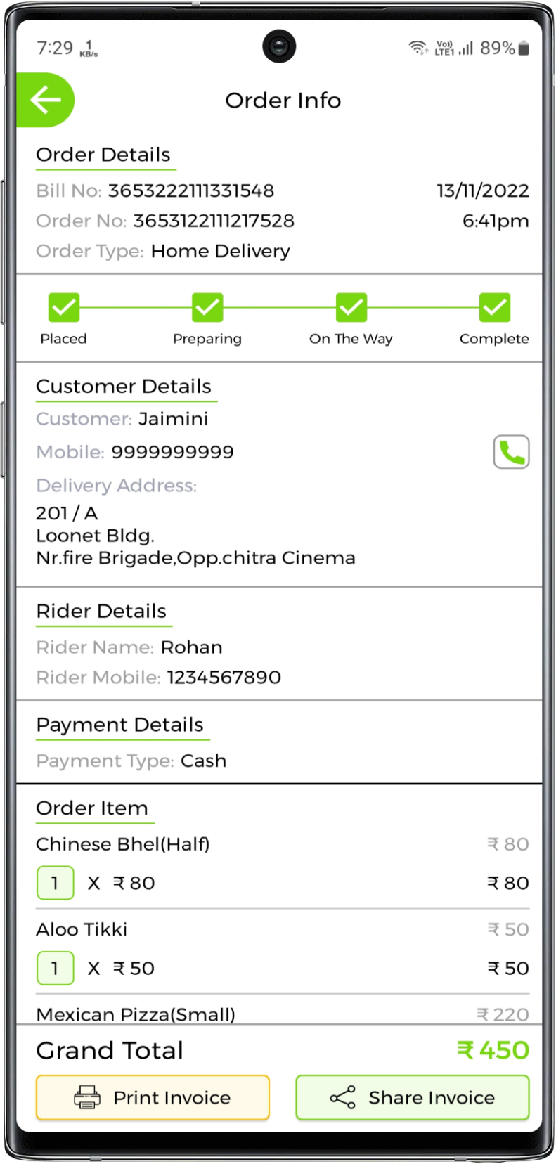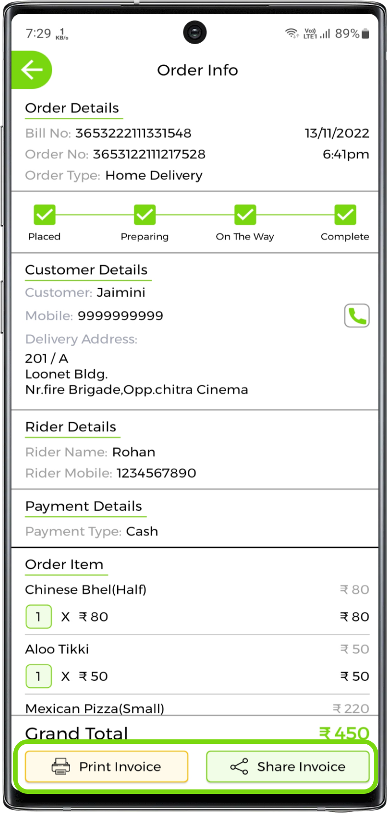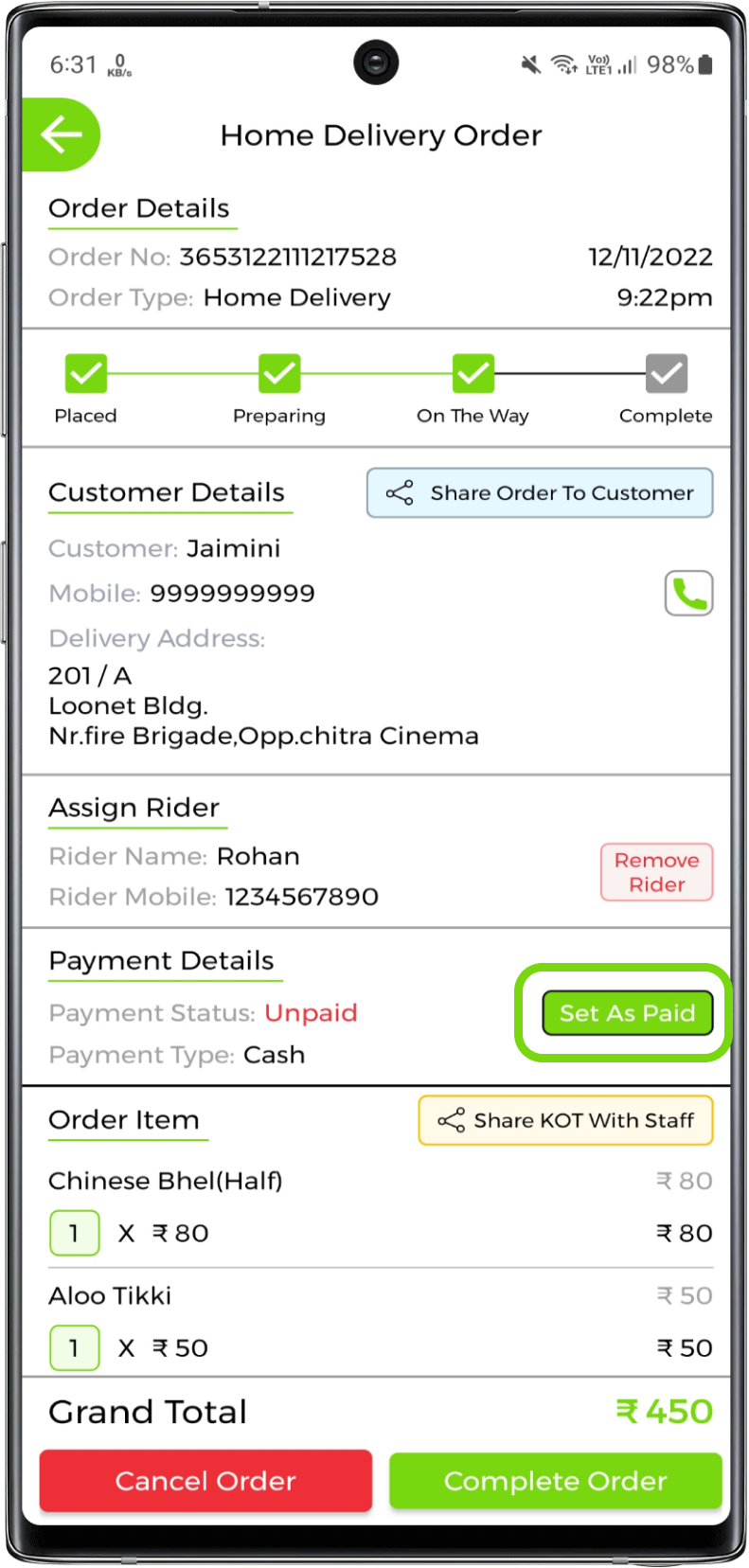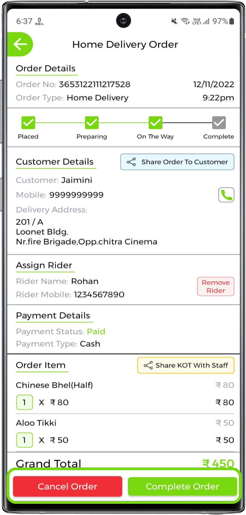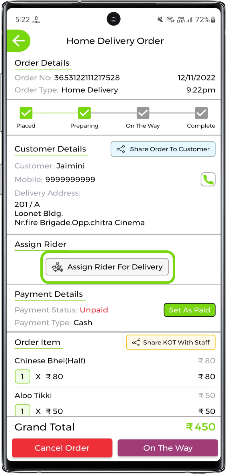 In this preparing stage you can add/update rider details like rider name and rider contact no who will deliver this order. This details will be viewed to customer to know who is going to deliver his food and he can even contact the rider