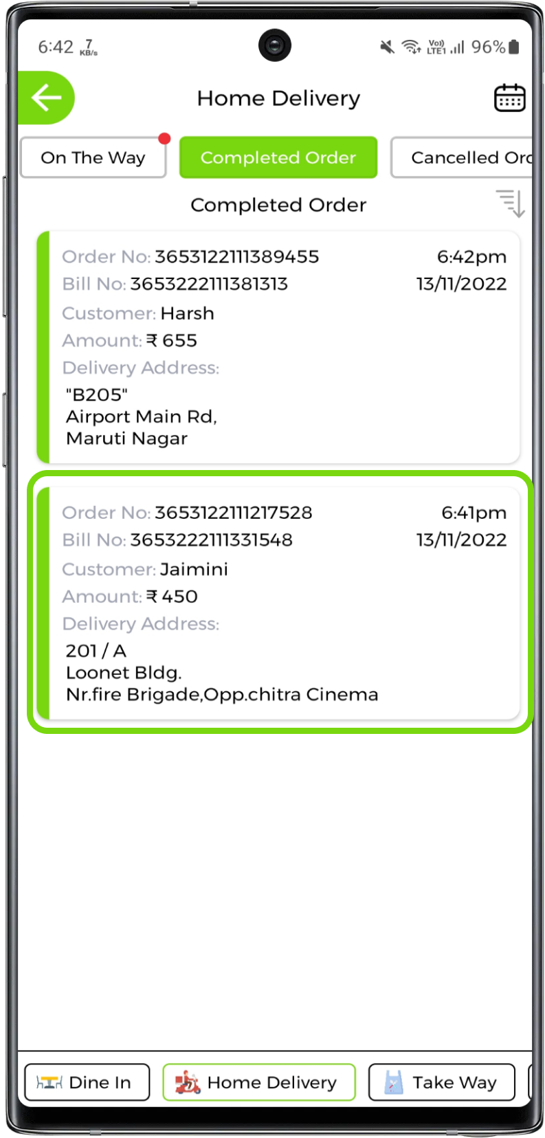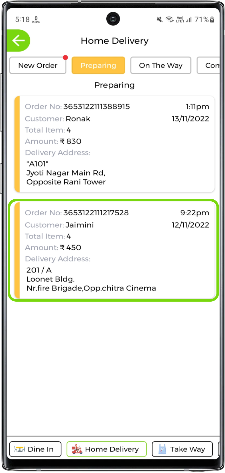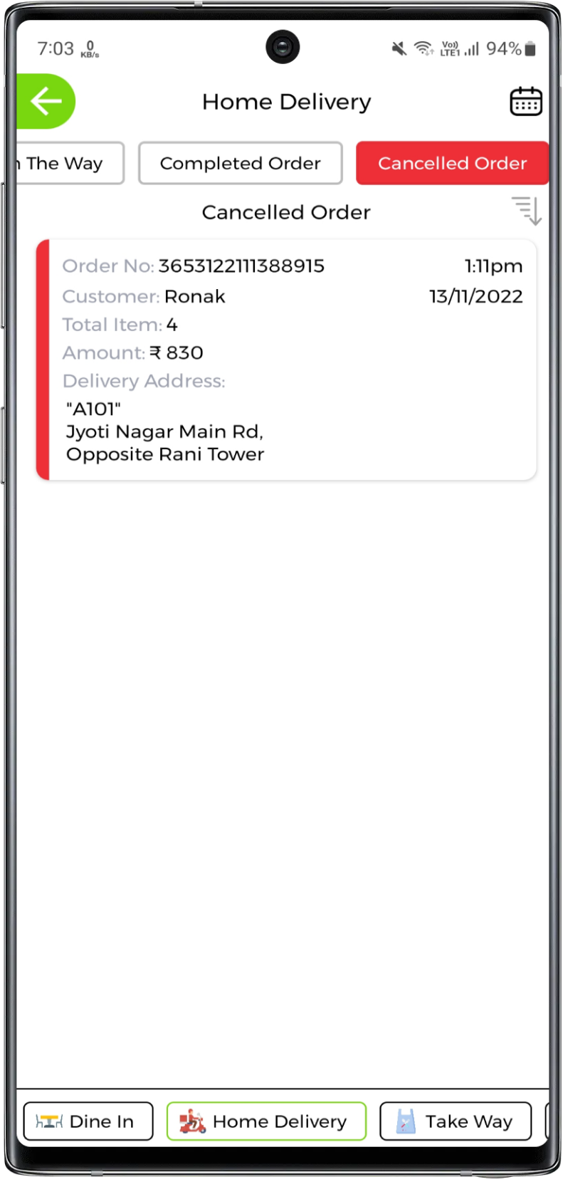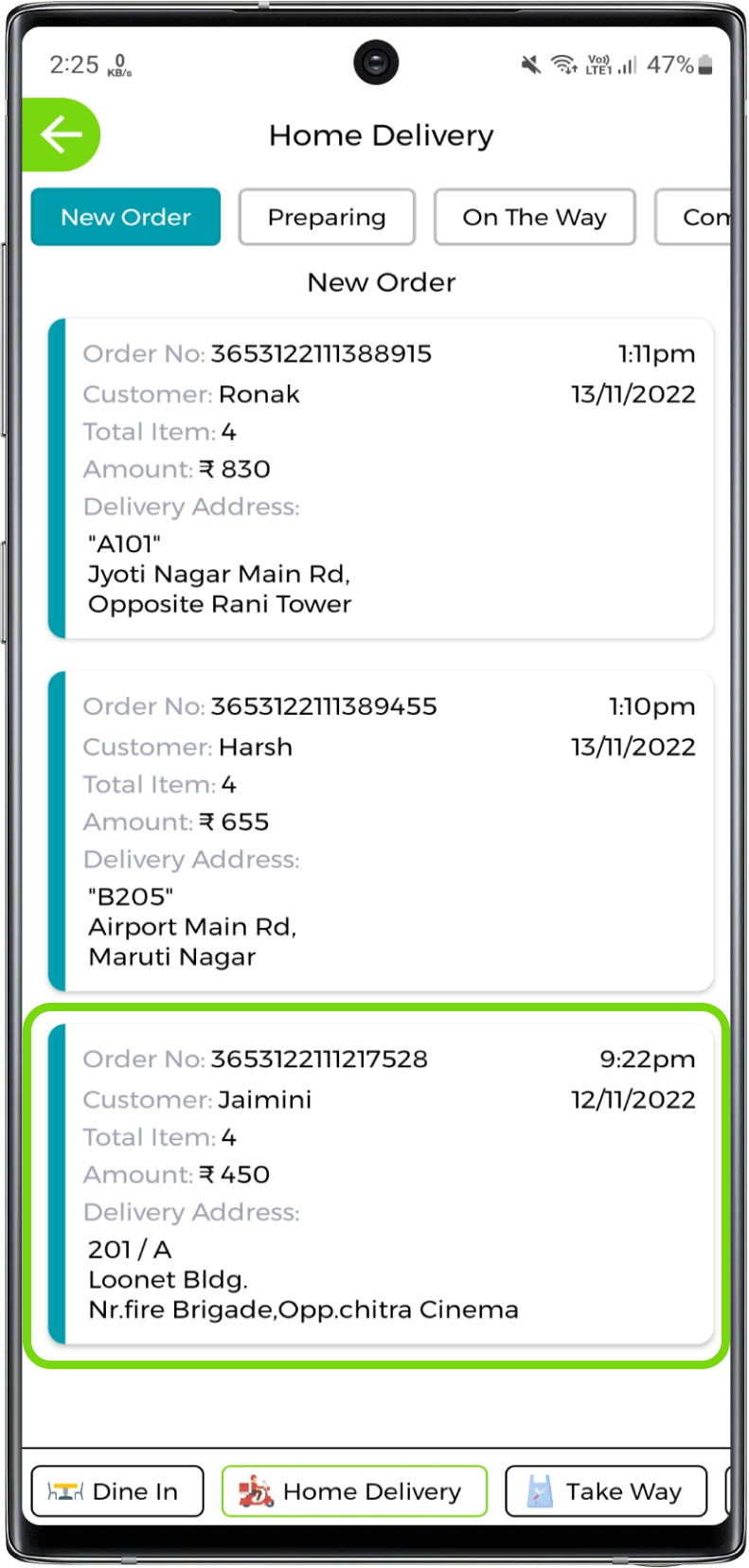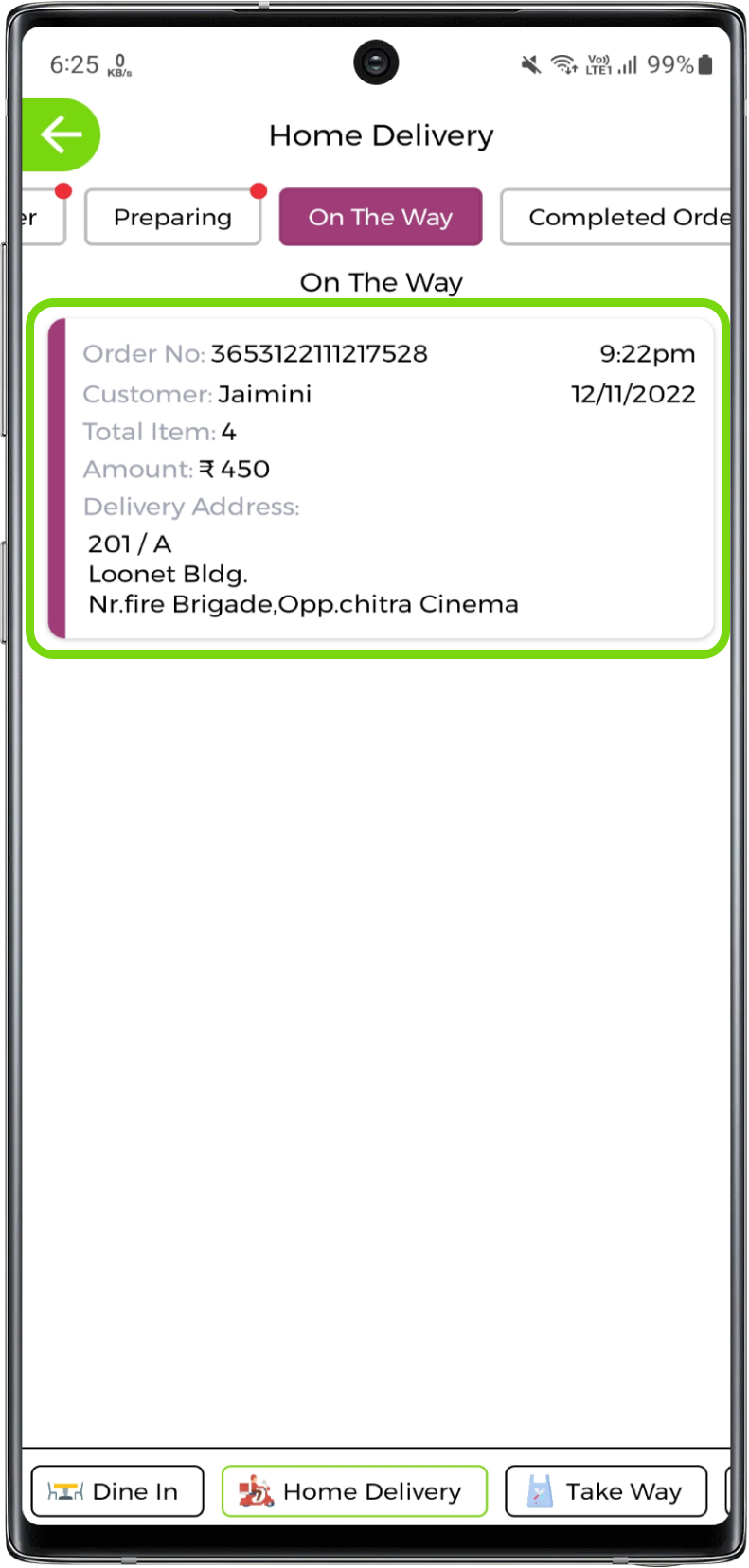 When home delivery order will be placed by the customer, it will listed in new order of home delivery service. Order is placed and its order no is Order No - 3653122111217528