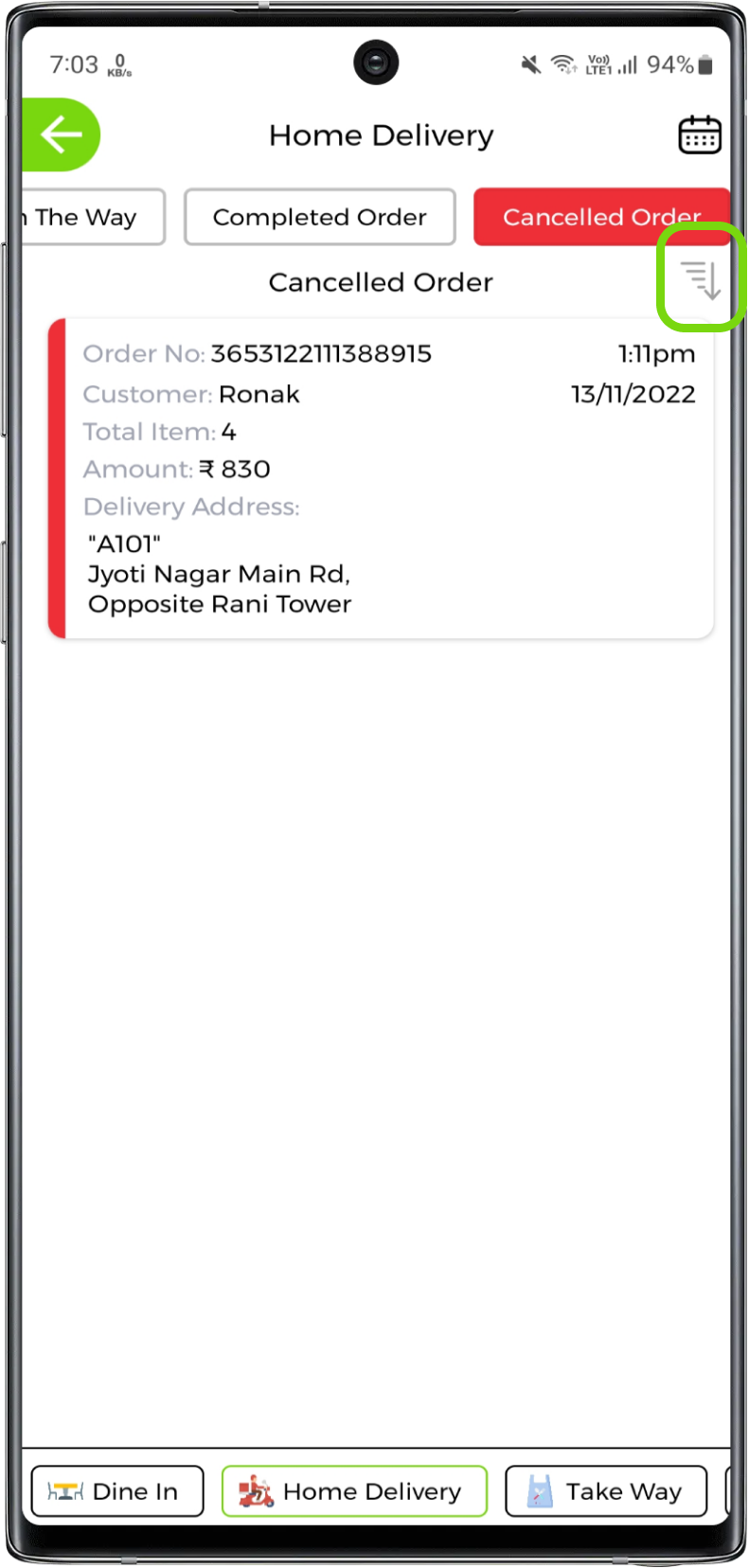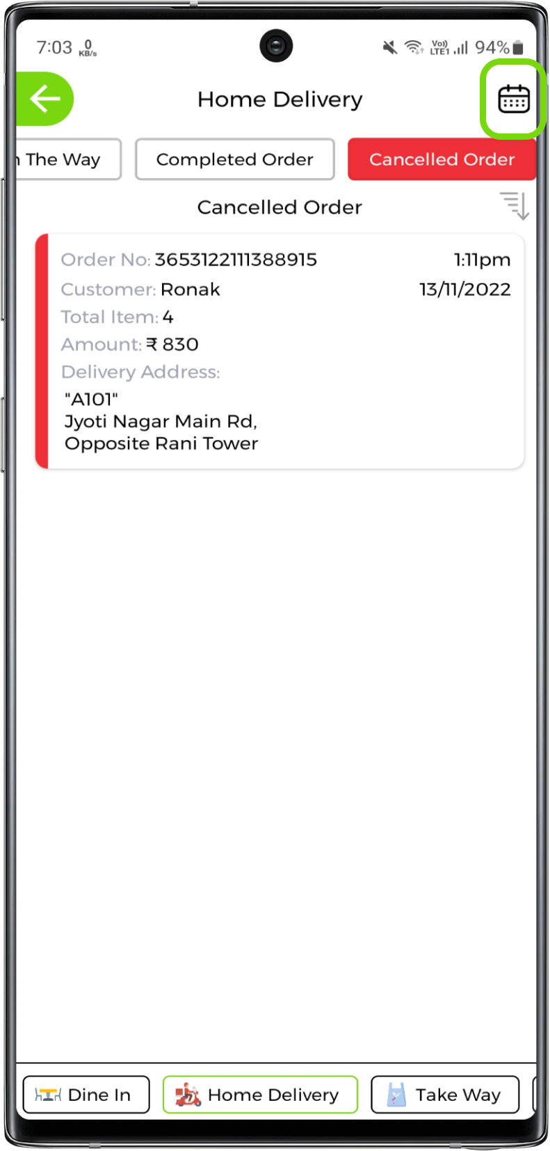 You can also view any dated cancelled orders by selecting the date from the on the top right corner