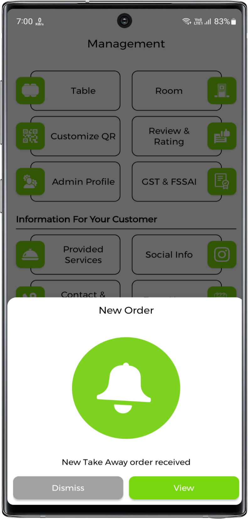 When you are active on InstantMenu application, and if customer place an order the dialog popup showing new order received will be appear on the screen
