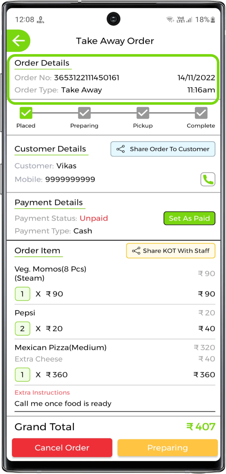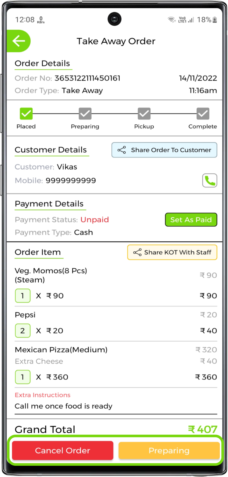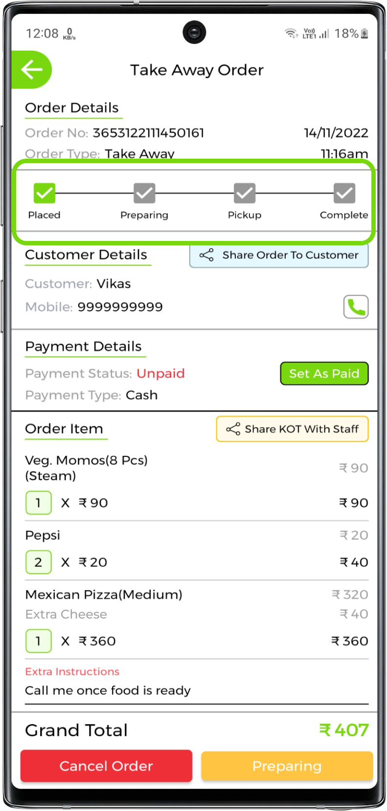 Either go onwards next stage or cancel the order. Here as we are in new order our next succeeding stage will be preparing so either click preparing or if you want to cancel the order then click cancel order