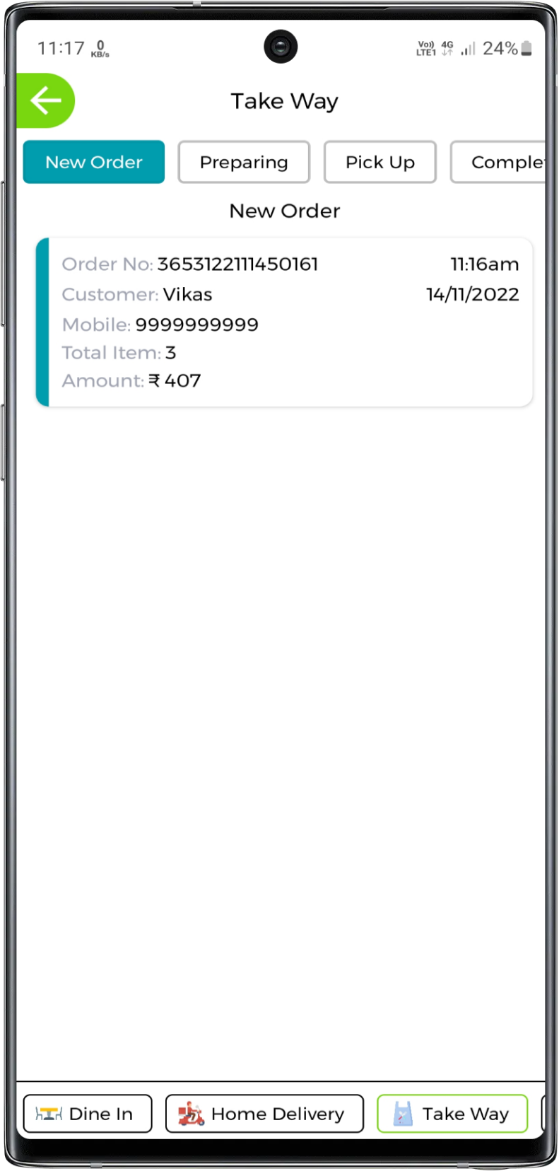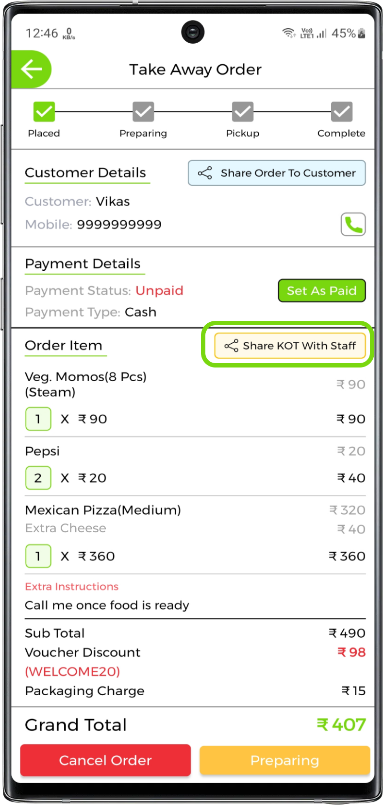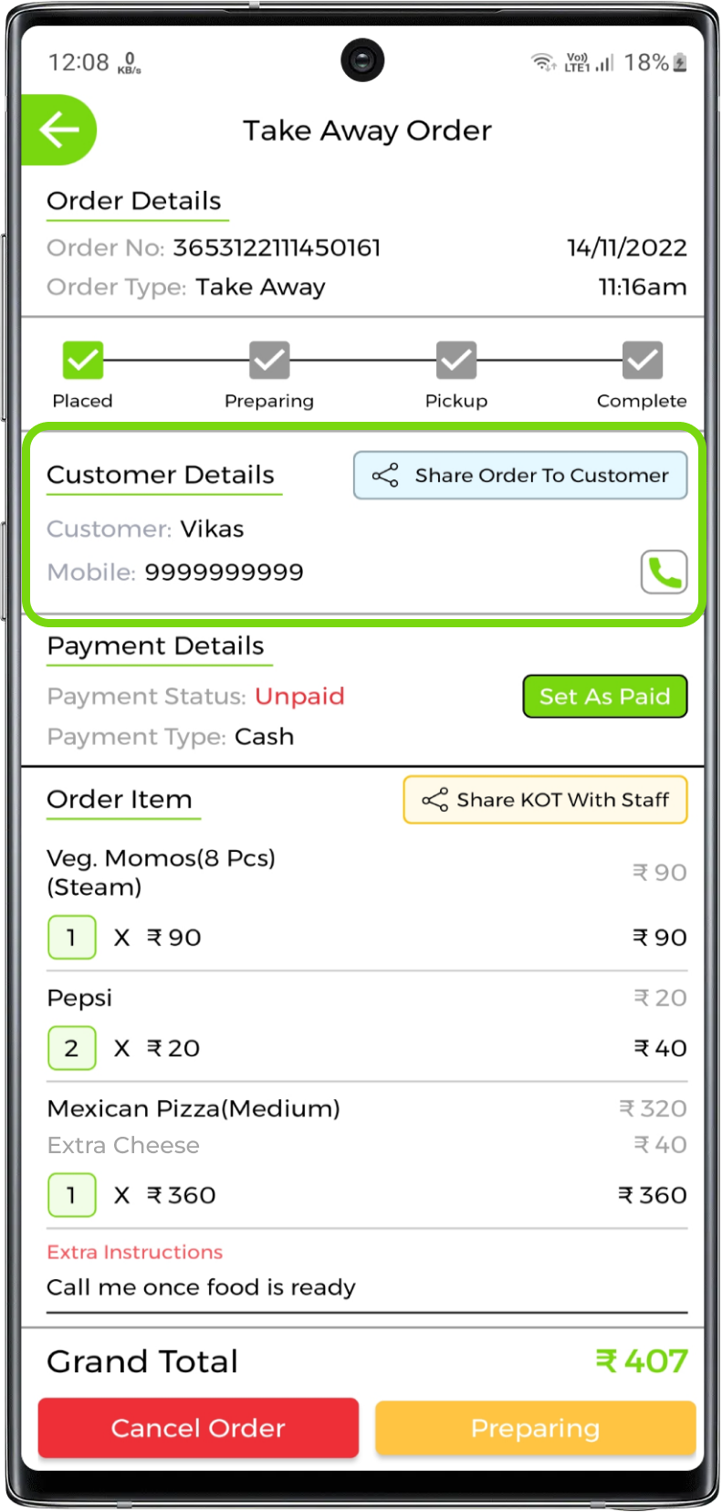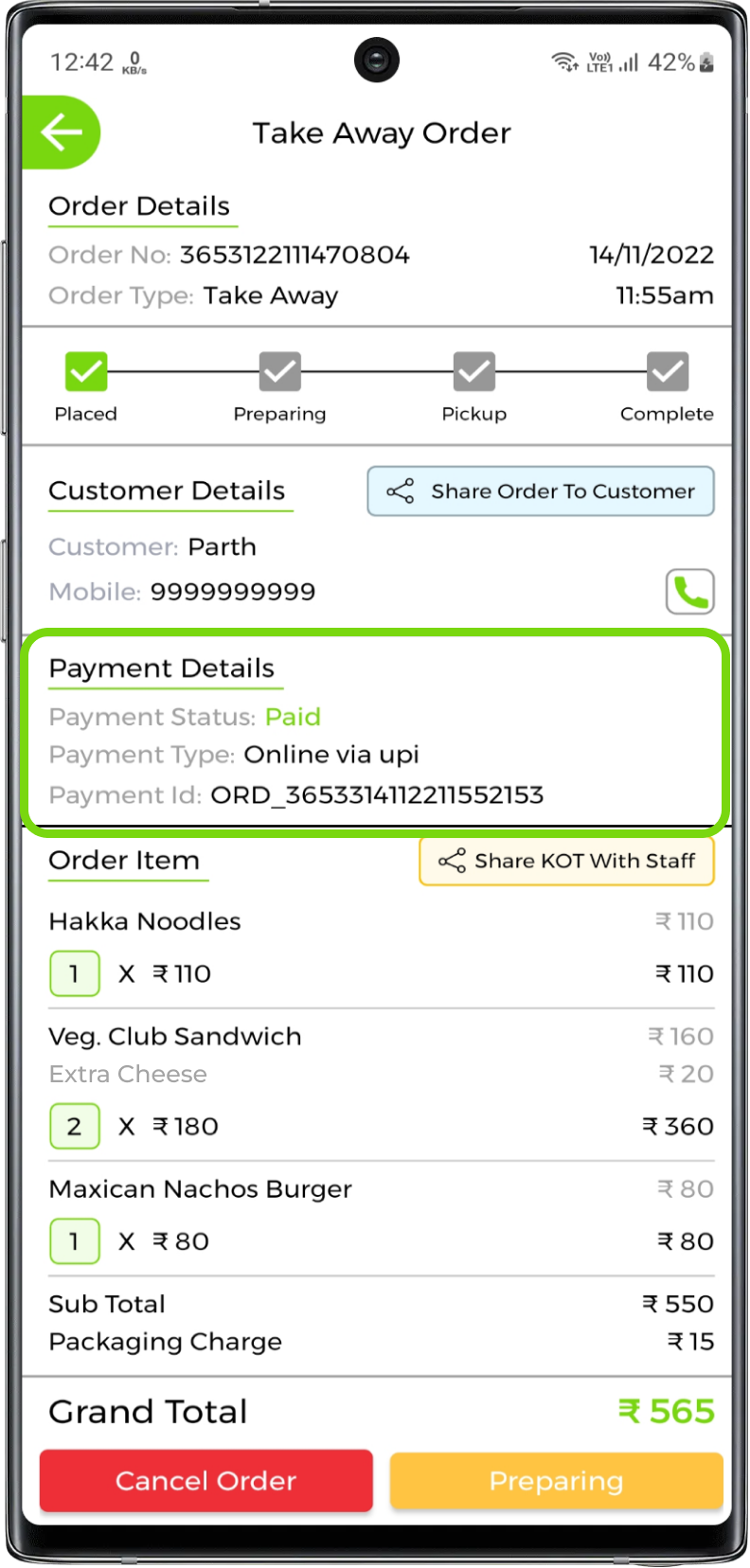 Either go onwards next stage or cancel the order. Here as we are in new order our next succeeding stage will be preparing so either click preparing or if you want to cancel the order then click cancel order