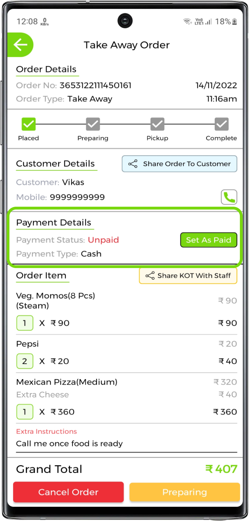 Payment would be done by two types either Online or Cash. If payment is done through cash then payment status will remain unpaid untill you manually not set order as paid. Set order as paid by clicking on the Set as paid. You can set order as paid only in new order, preparing and pickup stages