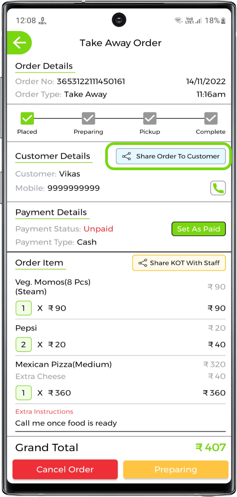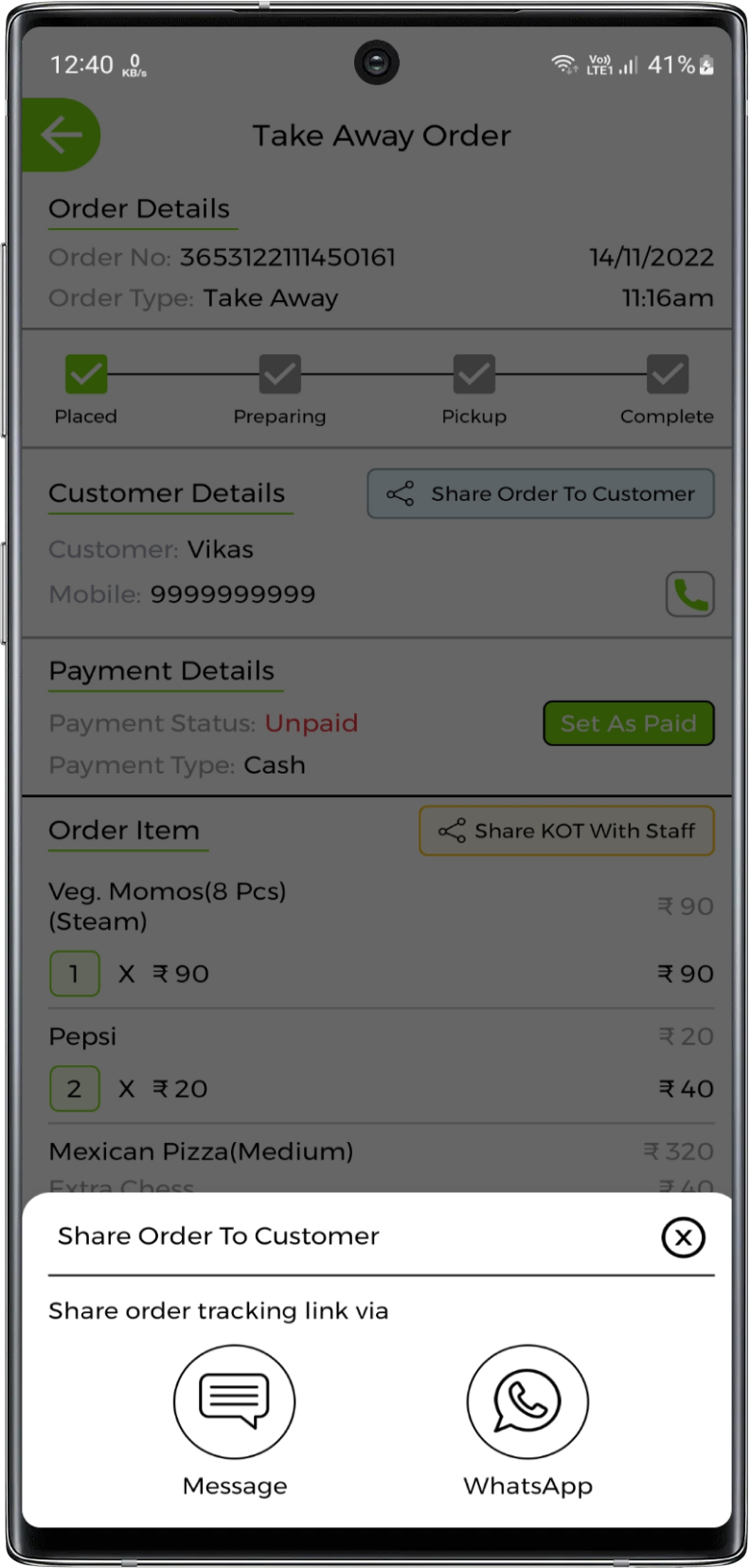InstantMenu provides you the feature of sharing the order to the customer in the form of either message or whatsapp. It's amazing right!