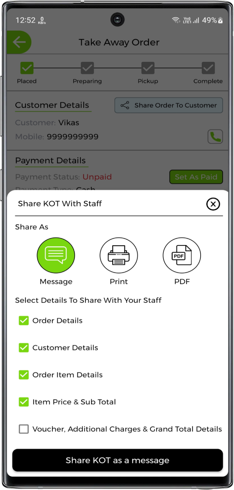 You can share KOT with your staff with conditions like which details you want to show/share to your staff. Details consists of order details, customer details, order item details, item price, subtotal, voucher, additional charge and grand total details. You can select any or all of the given below