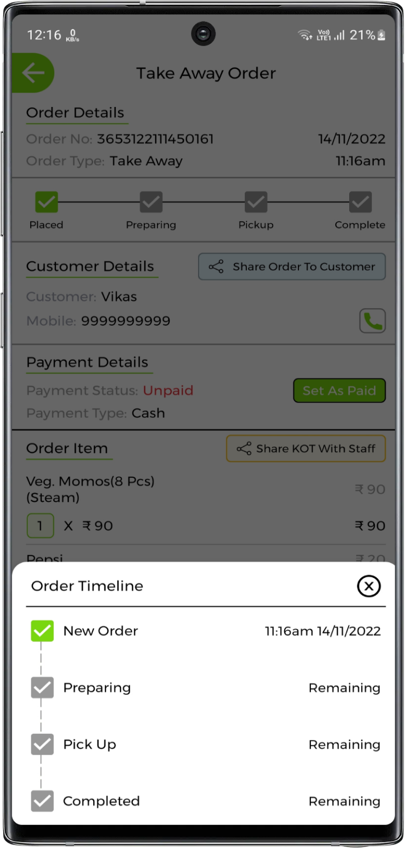 When you click the stages of the timeline you will get the date and time of the stages processed like at what time the order was placed, at what time the order was prepared, at what time the order was picked up, at what time the order was completed or cancelled etc.