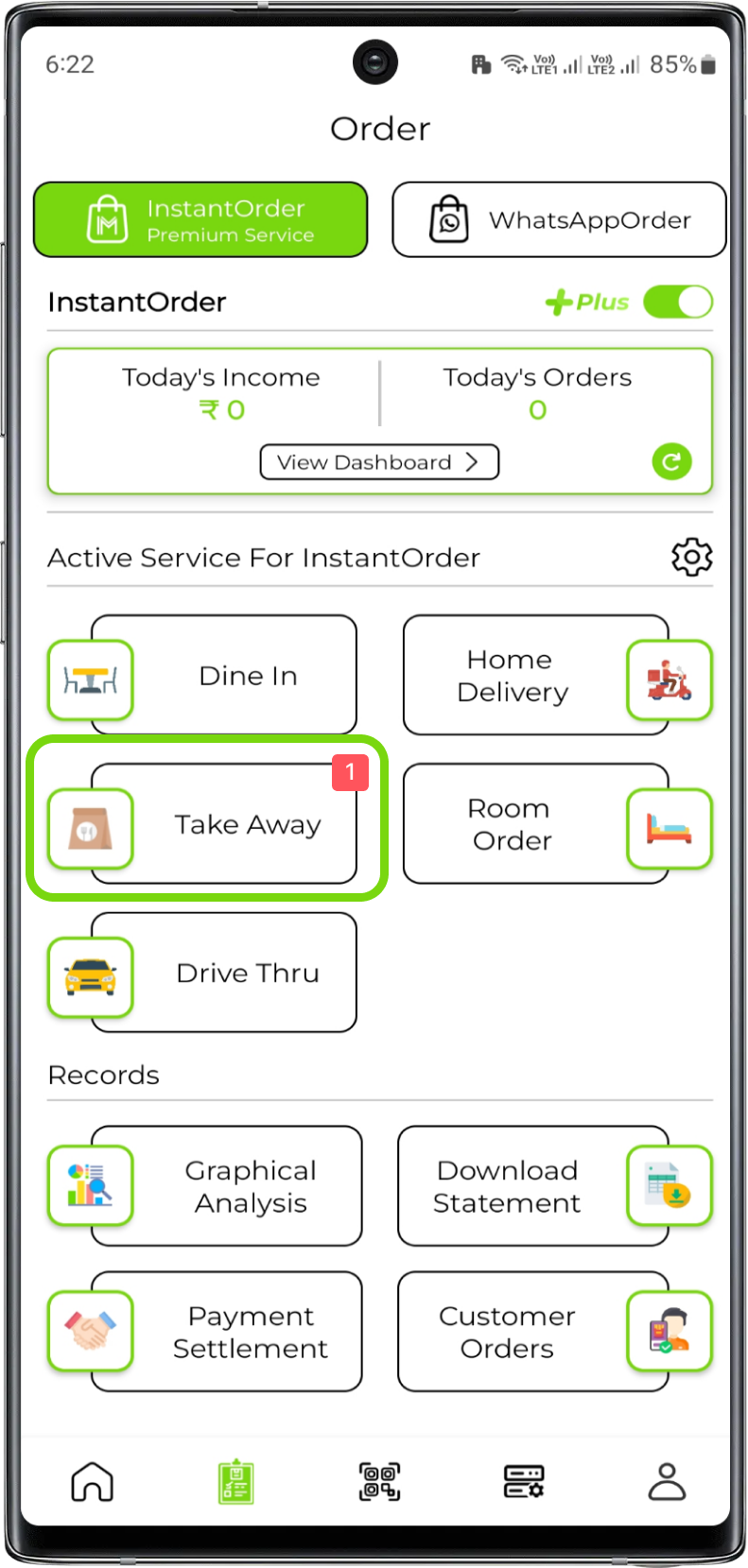 You can get the active order counts per services denoted with a red box on the corner. Click on the take away to view take away orders