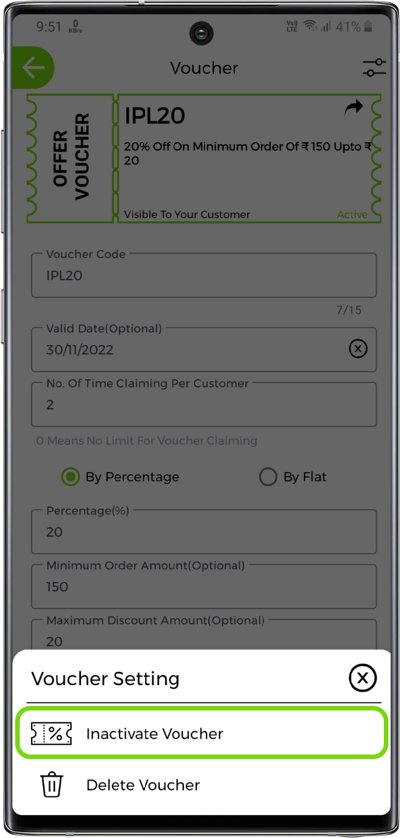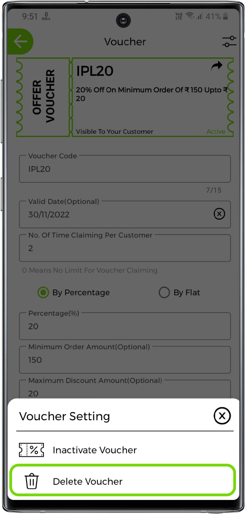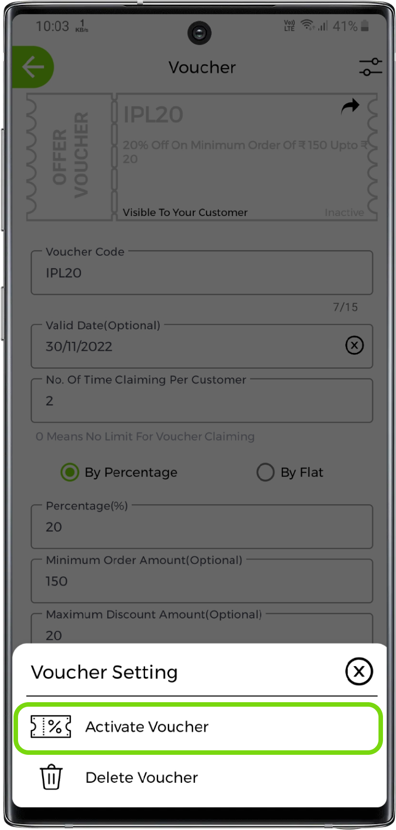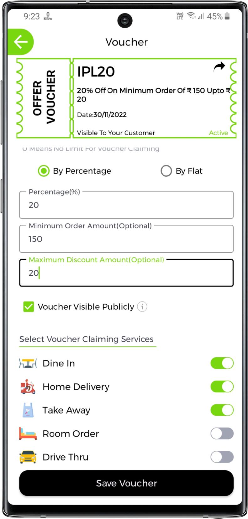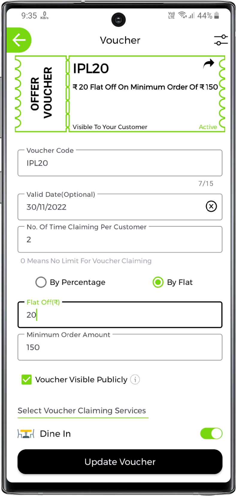 Enter the voucher offer value in percentage or flat. Also, you can set minimum order amount like on how much minimum amount you want to give offer and, you can also set maximum discount amount like upto how much maximum amount this voucher is valid