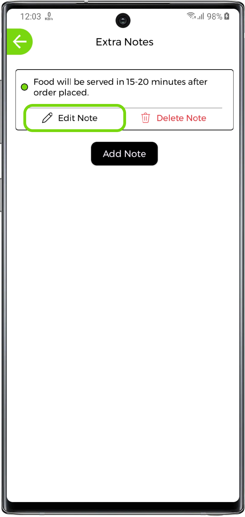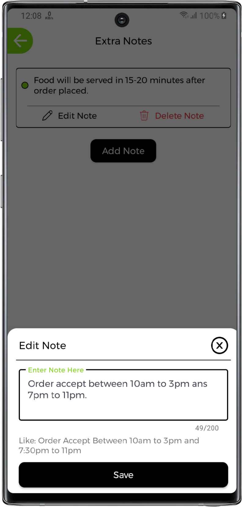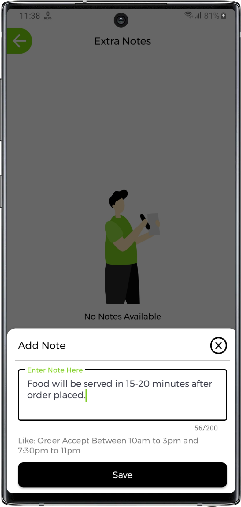 Write down the notes like - Food will be served in 15-20 minutes after order placed, Please check the parcel before carrying out, Order accept between 10am to 3pm and 7pm to 11pm, etc.