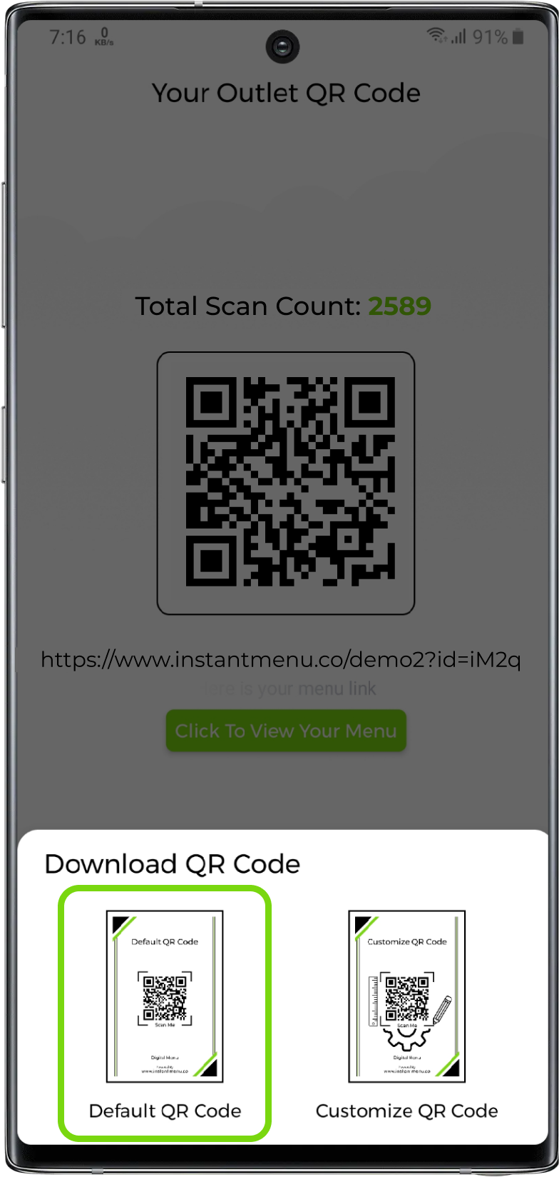 InstantMenu offers two different types of Downloading QR. The first is "Default Download", where you just need to save the pre-readymade QR code design. The second option is called "Customize Download" where it enables you to customize your own QR code with different text color, background color, background image, add logo.