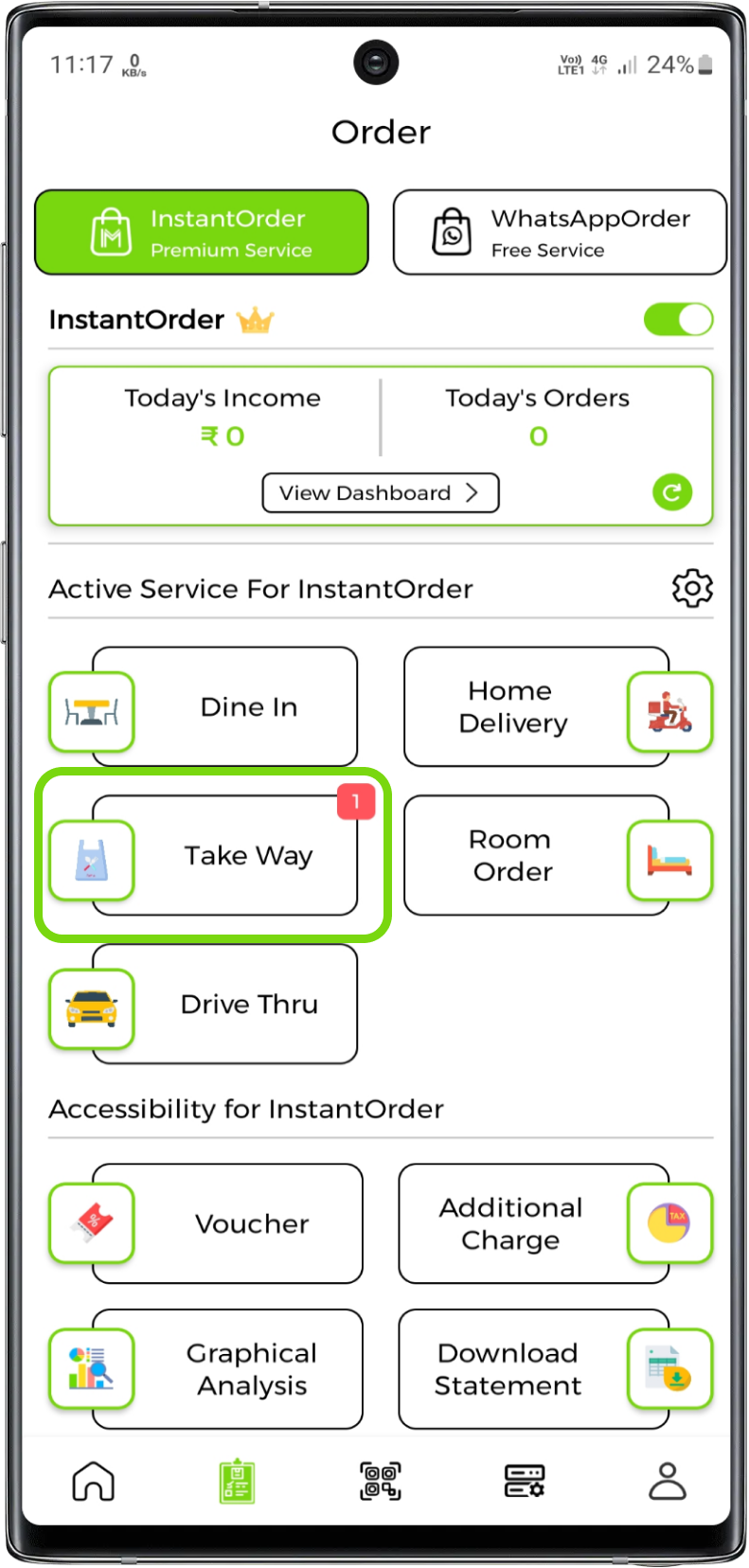 You can get the active order counts per services denoted with a red box on the corner. Click on the take away to view take away orders