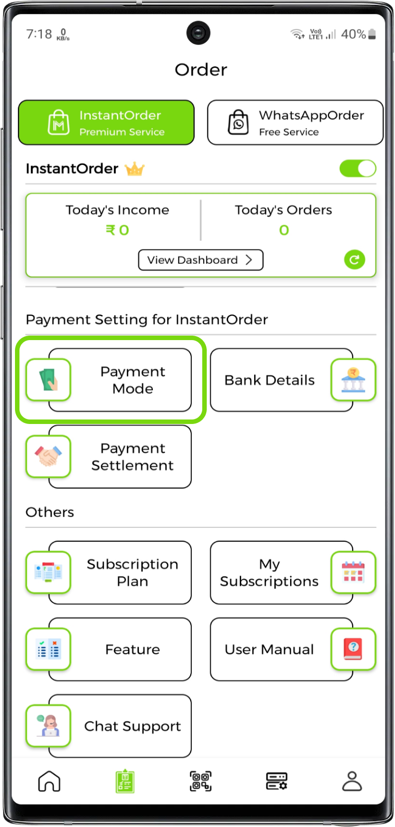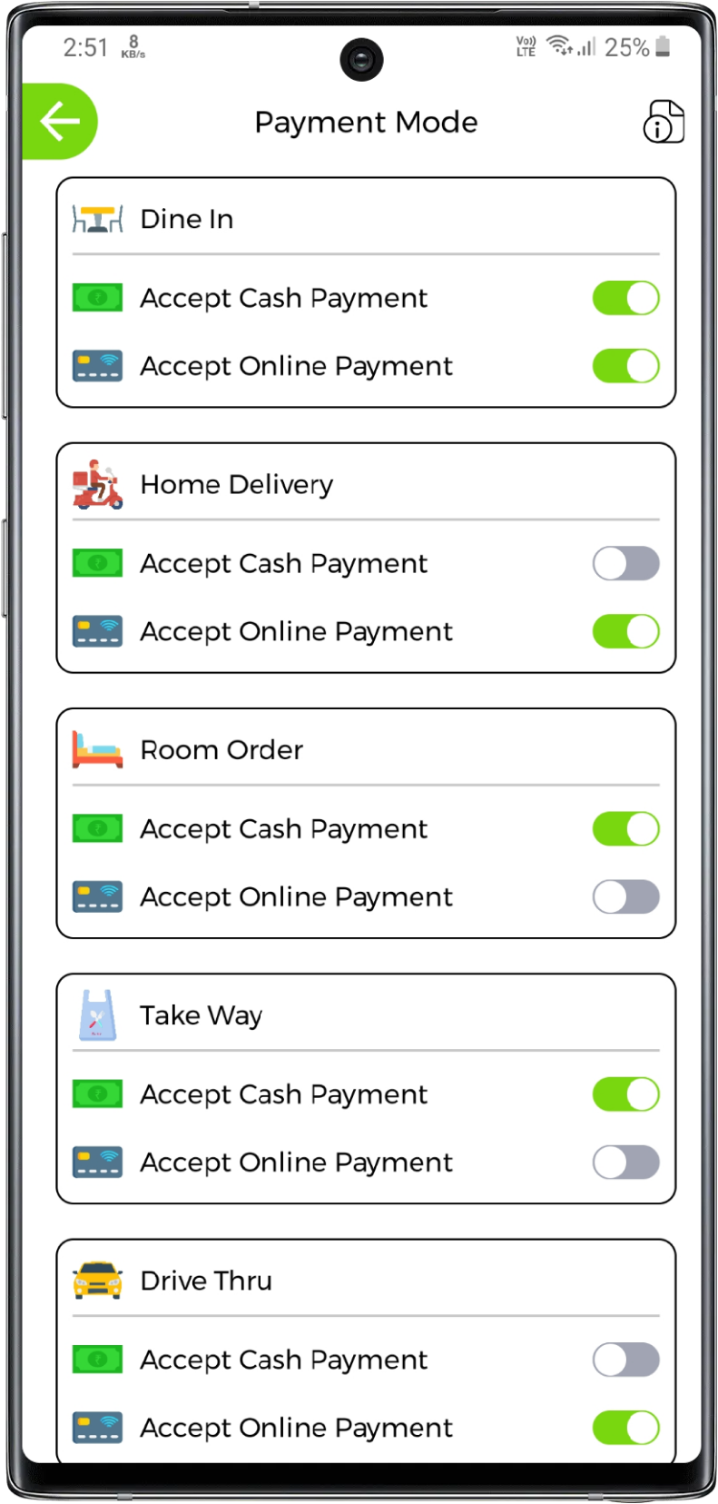Toggle on or toggle off the payment modes for different services like if you want only cash payment in takeaway just toggle on cash payment of takeaway and you will receive orders through cash payment only, if you want only online payment in drivethru, home delivery just toggle on the online payment of drivethru and homedelivery and you will receive only online orders for drivethru and home delivery or else if you want order payment in both modes - cash and online in dinein service just toggle on the cash as well as online payment modes of dinein
